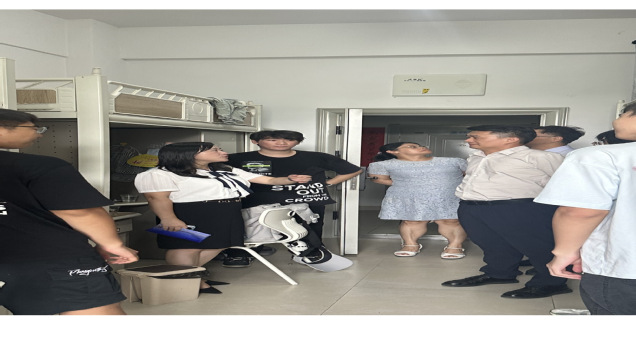 在寝室中,学院领导与新生们进行了深入的交流,领导们不仅询问了新生们关于入学、住宿环境等方面的基本情况,了解了他们的兴趣爱好、未来规划以及对大学生活的期待与困惑,还细致入微地关注到了他们的家乡,以及来到湖北武汉这个热情的“大火炉”的适应情况。领导们耐心解答了新生们关于专业学习、校园生活方面的疑问。田浩特别强调了学院在人才培养方面的特色与优势,鼓励新生们珍惜学习时光,深入钻研专业知识,培养创新思维和实践能力,“要积极参加专业竞赛,追求卓越,最终实现自我价值。”田院长如是说。
