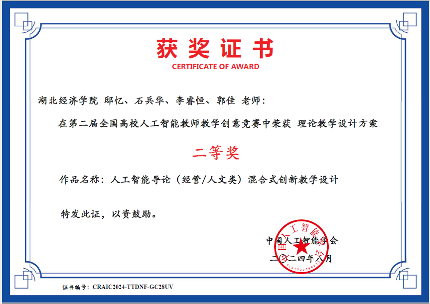 本次比赛旨在挖掘和推广人工智能领域中的优秀教学案例,推动人工智能教学创新,促进教学方法跨界融合,探索人工智能教育的无限可能。《人工智能导论》(经管/人文类)作为省级金课,是面向全校各专业本科生的通识选修课,该课程秉持“信息固本,经管铸魂”的教育理念,围绕智能科学思维方法、关键技术在经济、管理及人文社科领域中的应用,进行概念原理阐述和科学知识普及,为学生构建起一座连接理论与实践、技术与应用的桥梁。