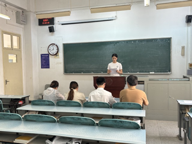10月12日,现场答辩在教学楼一号楼教室举行。本次答辩分四组进行,每组答辩评委由教工党员和学生党员担任。答辩题目包括问答题、时政题和主观题。