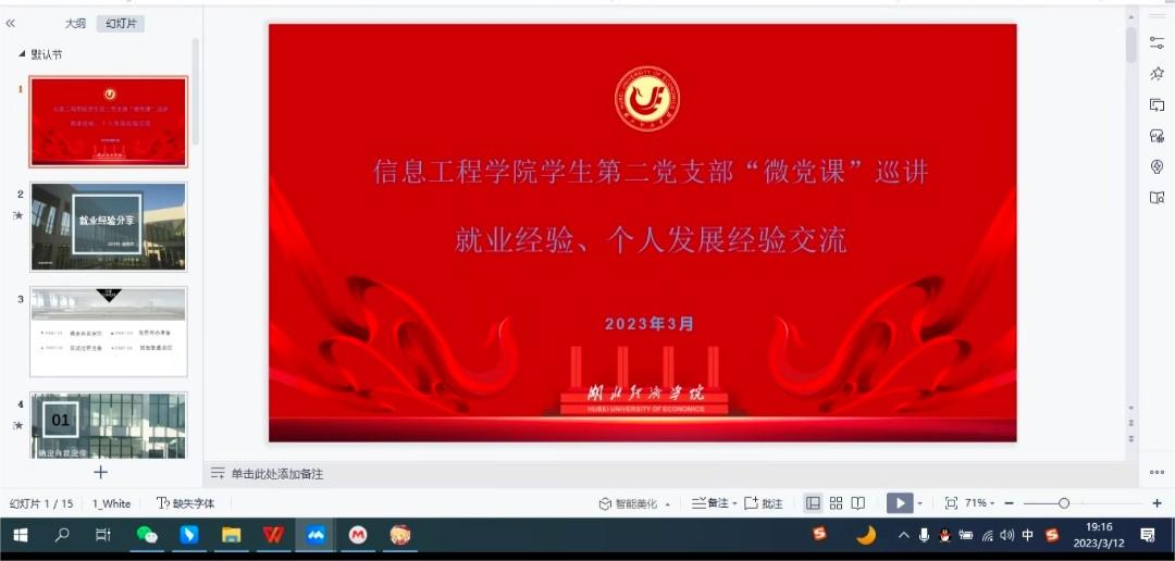 本次党员“微分享”为同学们生动展现了毕业生毕业后的工作状态和个人感悟,为即将踏入毕业年级的同学们做出了积极引导,也展现了青年党员的担当与示范引领作用。就业不是一蹴而就,需要在各种不确定性中寻找一个属于自己的确定方向,相信每位毕业生都能敢于尝试,做好自己。