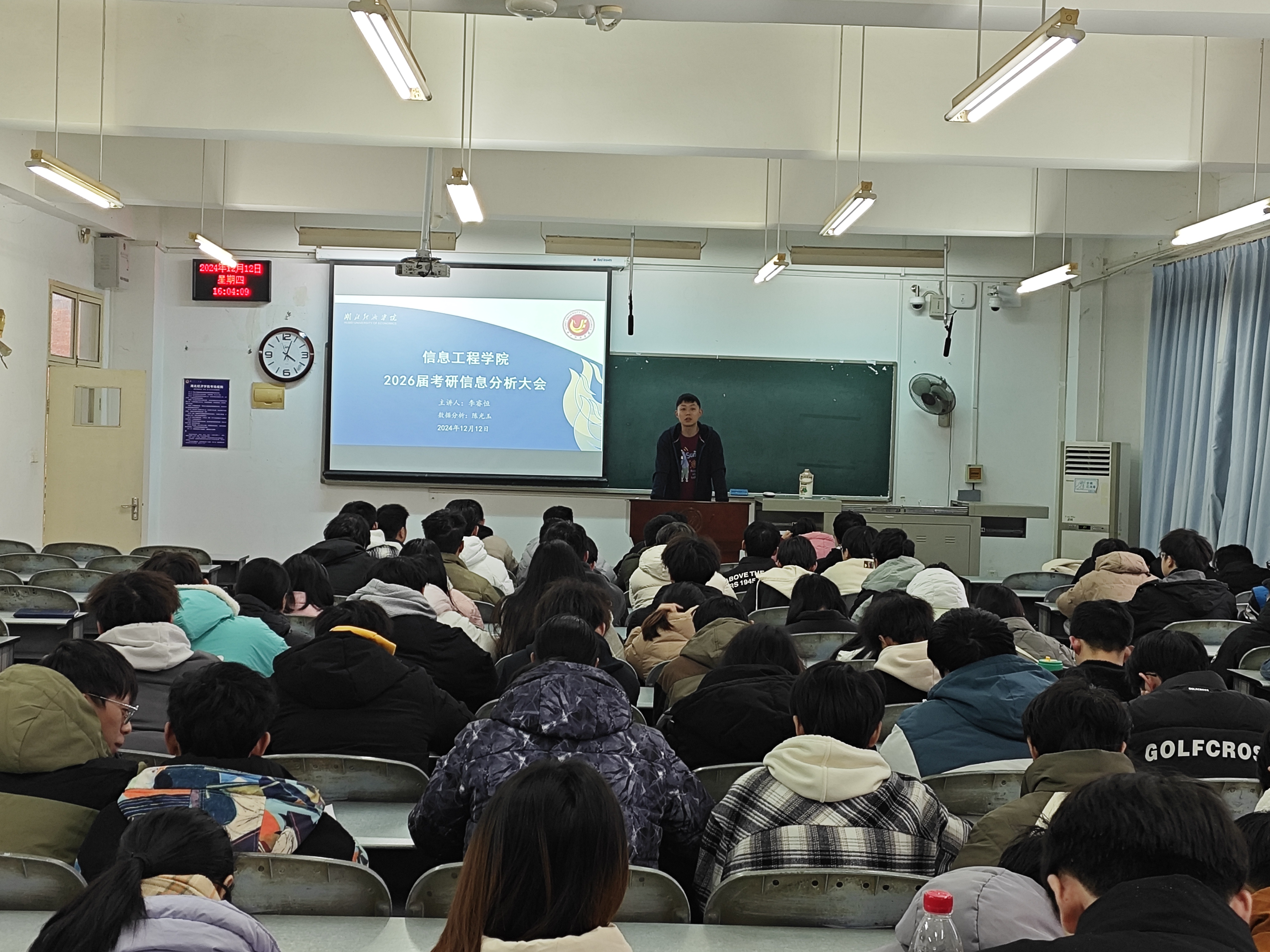 本网讯(通讯员:陈光玉)2024年12月12日下午,我院2026届学生考研信息分析大会在一号教学楼318成功召开。本次大会由副院长李睿恒主讲,2026届具有考研意向的百余名学生参会。
