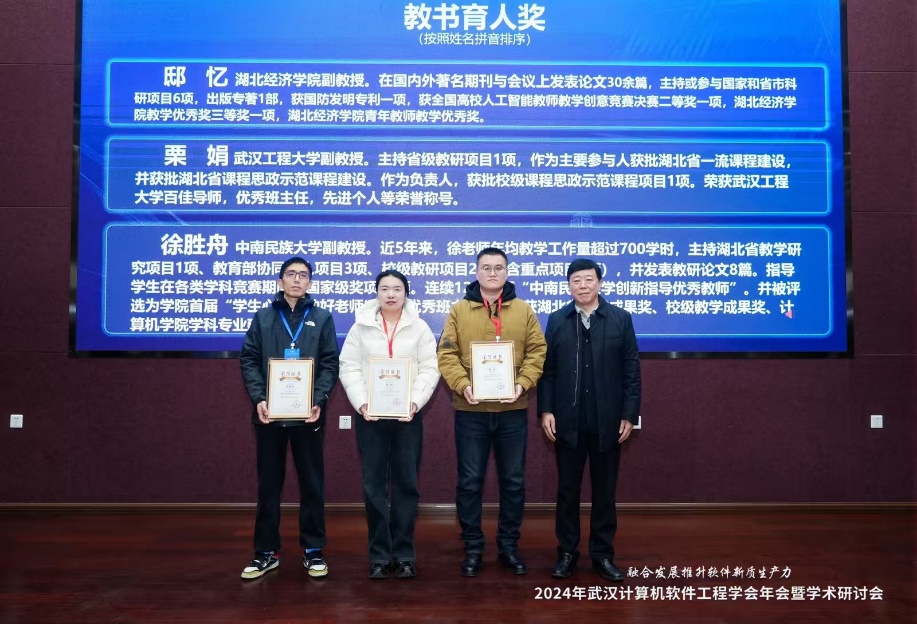 本网讯(通讯员:邸忆)在2024年12月14-15日举办的武汉计算机软件工程学会年会中,我院人工智能系主任邸忆被学会授予教书育人奖,表彰其在人工智能通识教育与人才培养中取得的突出贡献和优秀成果。