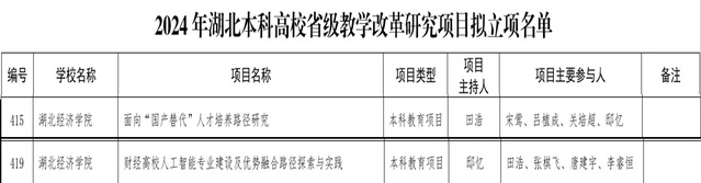 本网讯(通讯员:吕植成)近日,湖北省教育厅高等教育处正式公示了2024年湖北本科高校省级教学改革研究项目拟立项名单,我院申报的两个项目成功入选,标志着我院在教育教学改革领域取得了新的重要突破。