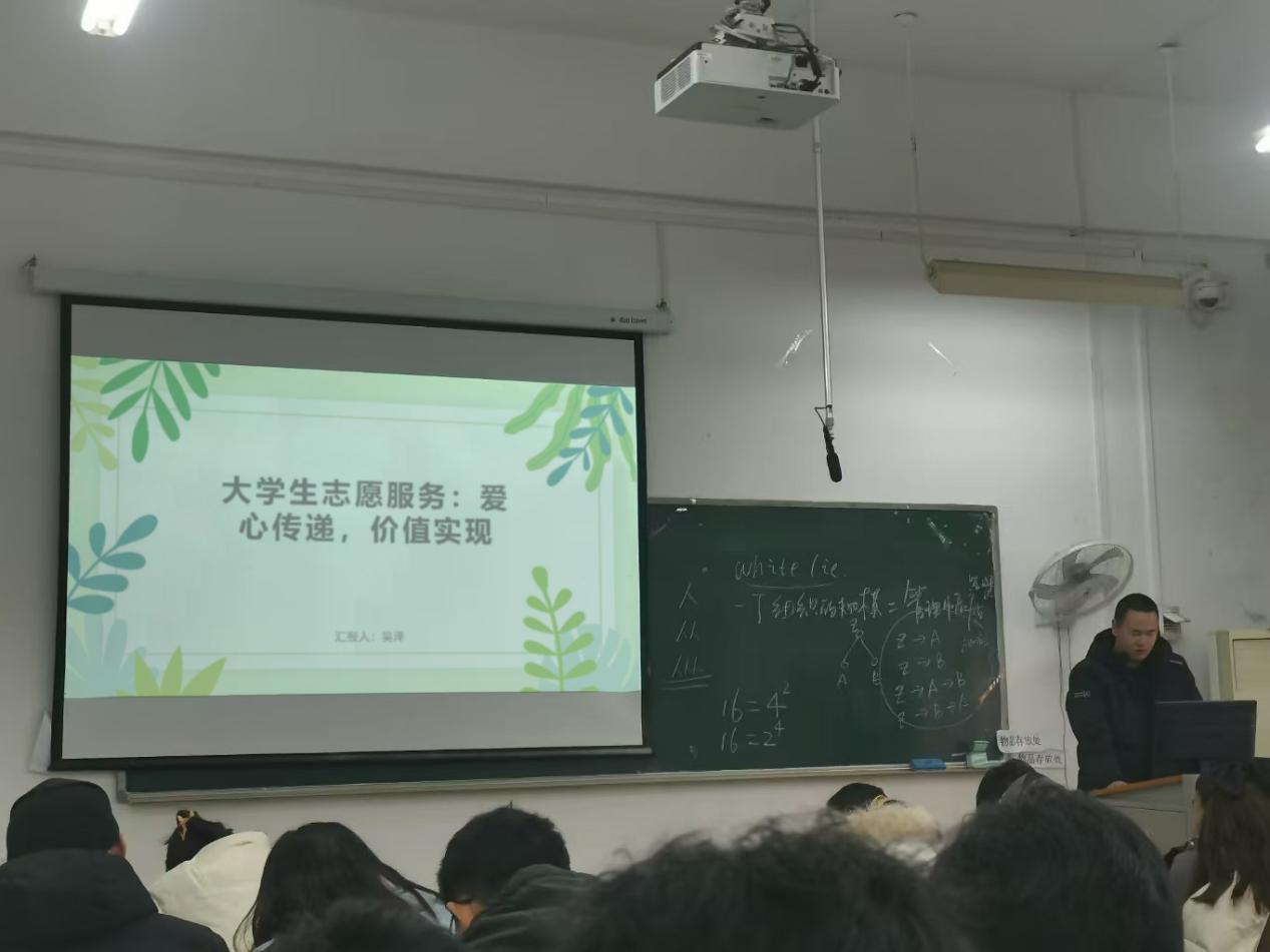 本网讯(通讯员:周晶 吴泽)为号召大学生积极投身志愿服务,实现自我价值。2024年12月29日,tyc5997太阳集团学生第二党支部党员吴泽,在J2-403教室面向计科2341班及物联网工程2341班的全体同学,进行了一场题为“大学生志愿服务:爱心传递,价值实现”的志愿服务心得分享会。