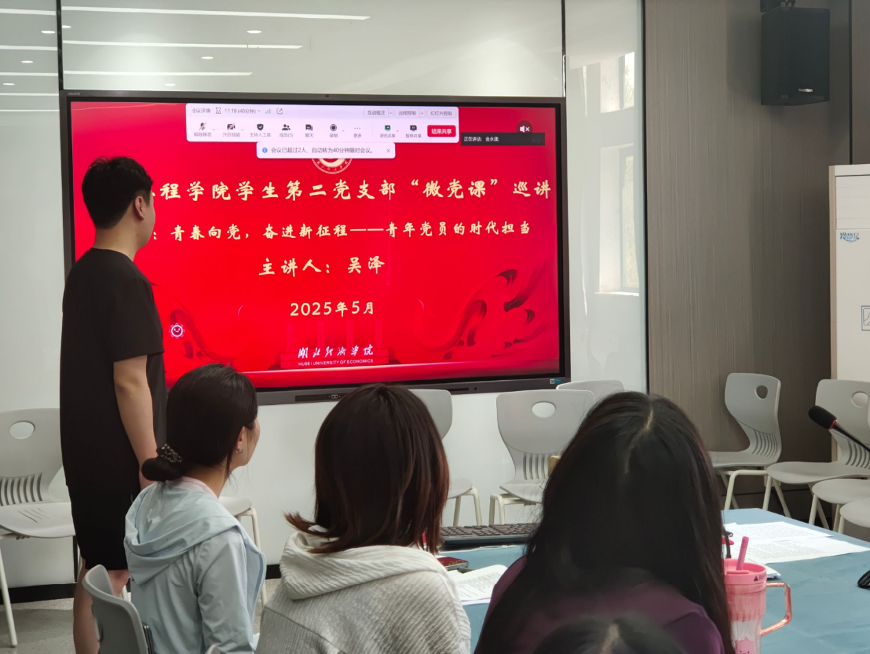 2025年5月12日,我院学生第二党支部在知行楼328会议室开展以“青春向党,奋进新征程——青年党员的时代担当”为主题的微党课活动,党支部党员吴泽担任主讲人,党支部全体党员同志参加学习。