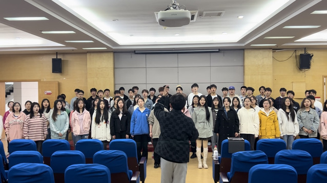 图为邓羽老师带领同学们进行歌曲合唱练习