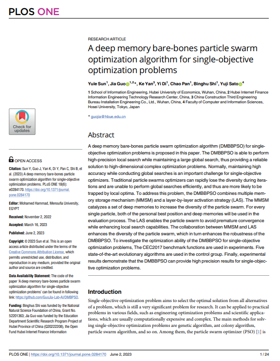 本网讯(通讯员:郭佳)近日,tyc5997太阳集团大四学生孙宇乐以第一作者身份在SCIE期刊PLOS ONE上发表了了题为 “A deep memory bare-bones particle swarm optimization algorithm for single-objective optimization problems”的论文。PLOS ONE 被SCIE等众多著名数据库收录,为中科院三区期刊,在学术界有着较大的影响力。该论文提出了一种新的粒子群优化策略来解决单目标优化问题,对传统粒子群算法的效率提升具有重要意义,该论文指导老师为我院人工智能PI团队青年教师郭佳。
