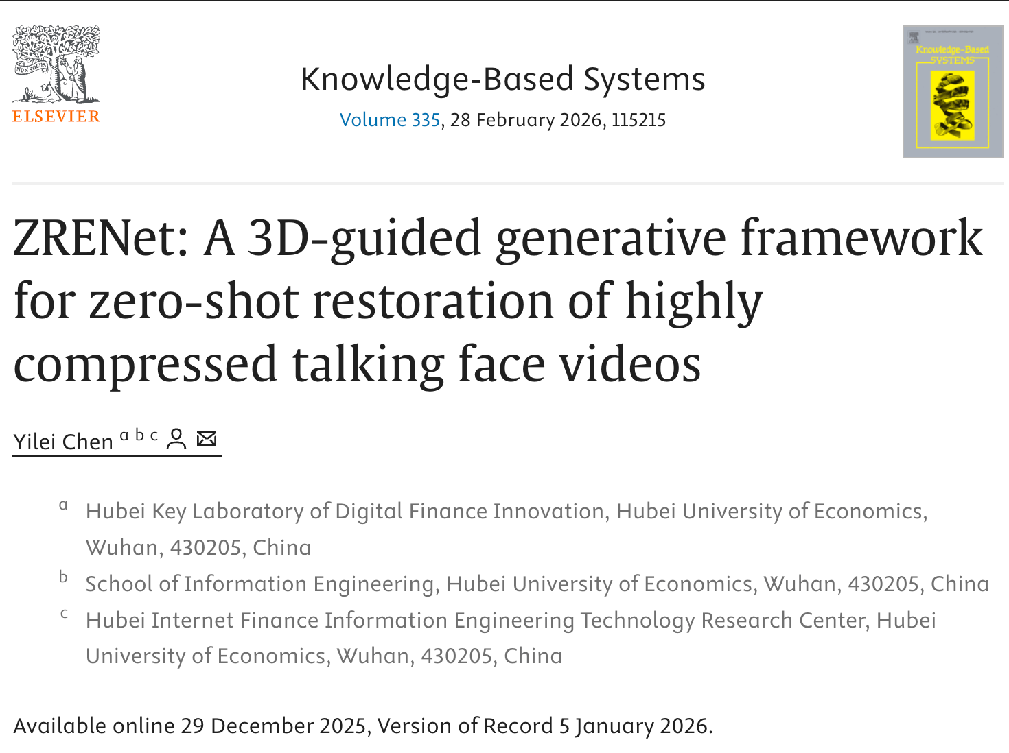 近日,我院陈燚雷博士以唯一作者身份在国际高水平学术期刊《Knowledge-Based Systems》上发表题为“ZRENet: A 3D-guided generative framework for zero-shot restoration of highly compressed talking face videos”的研究论文。
