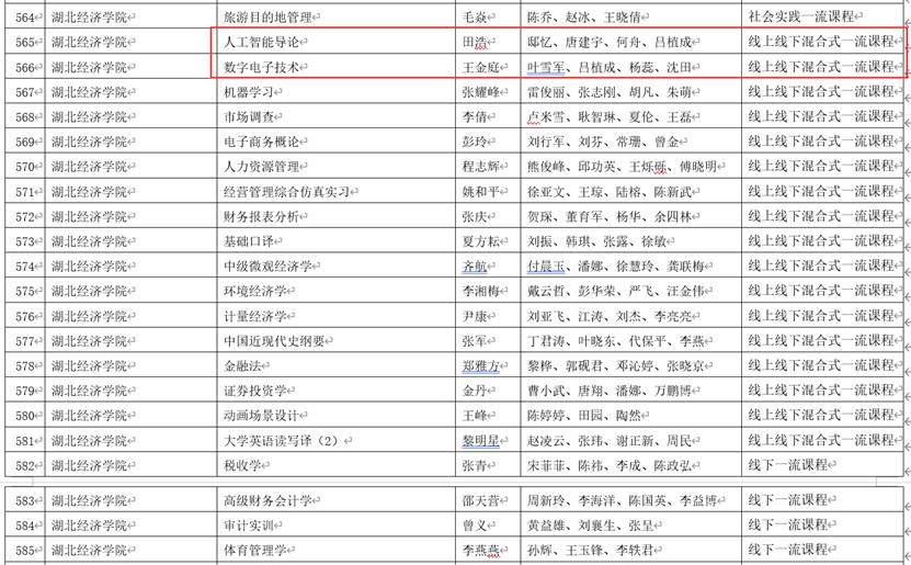 本网讯(通讯员:柯清华)近日,湖北省教育厅公示了湖北省2023年省级一流本科课程项目认定名单。我院田浩教授负责的《人工智能导论》、王金庭副教授负责的《数字电子技术》被认定为省级“线上线下混合式一流课程”。