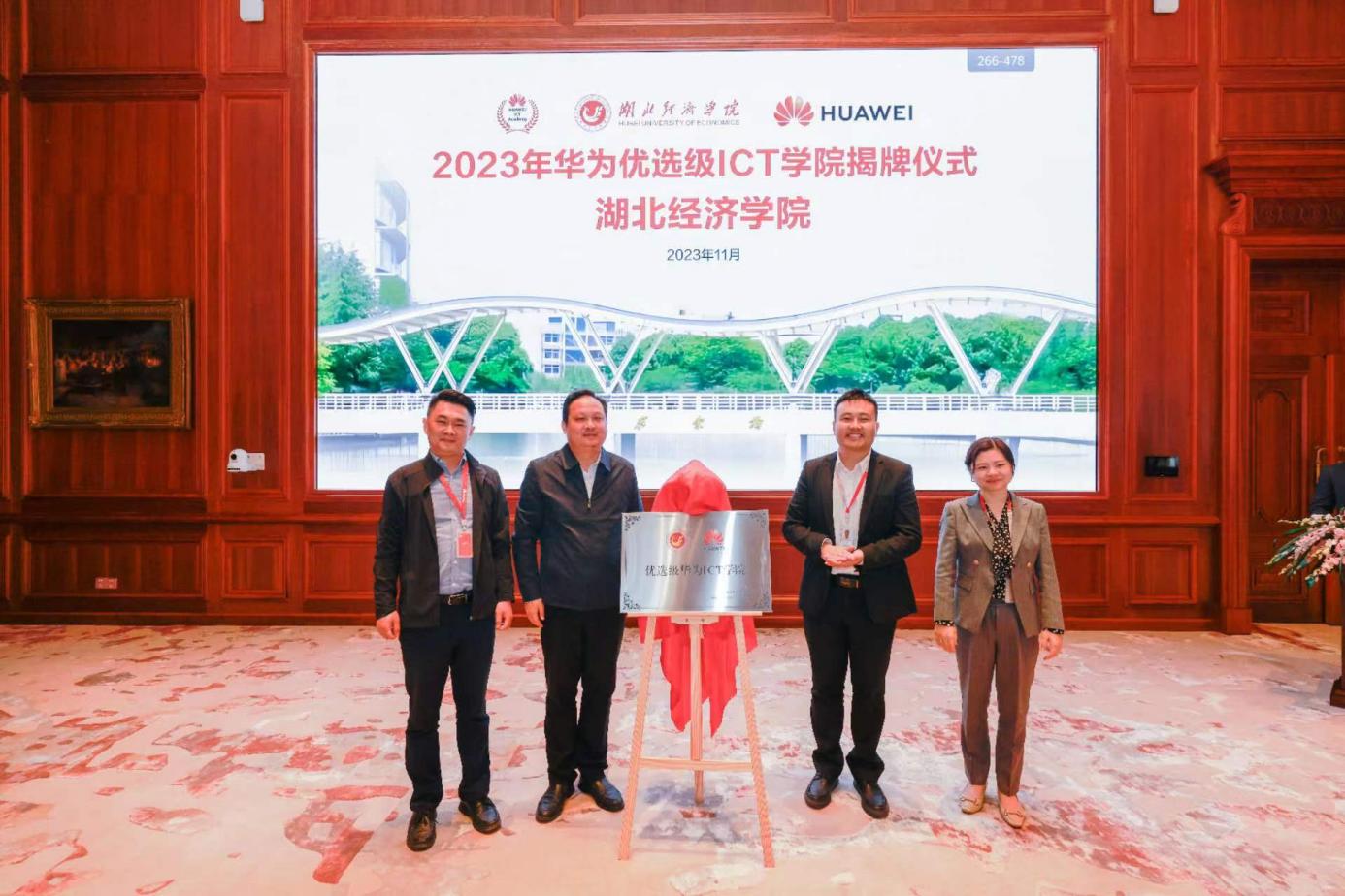 11月21日上午,在华为松山湖总部基地,我校与华为共同揭牌成立了太阳集团-华为信息与通信技术学院(简称华为ICT学院)。这一重要时刻标志着我校在培养ICT领域高素质应用型人才的道路上又迈出了坚实的一步,华为ICT学院将致力于推动产教深度融合,以促进我校信息类相关专业发展和人才培养质量提升。我校副校长付宏、华为湖北政企业务部副总经理王闯共同揭牌,我院院长田浩、湖北政企业务部教育行业代表范林芳出席揭牌仪式。