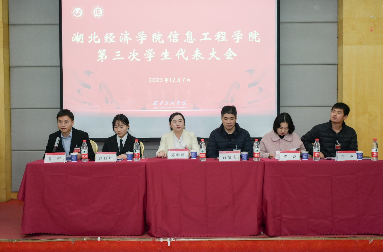 本网讯(通讯员:鲁琪 程熙 刘靖)12月7日,我院第三次学生代表大会在大学生活动中心三号报告厅召开,院党委副书记陈珊珊,副院长吕植成,计算机科学与技术系副主任陈婕,软件工程系副主任王正,人工智能系专任教师唐建宇,分团委书记鲁琪,辅导员陈光玉、李心怡出席,学院各专业210名学生代表参加。校学生会执行主席江雨红应邀出席。
