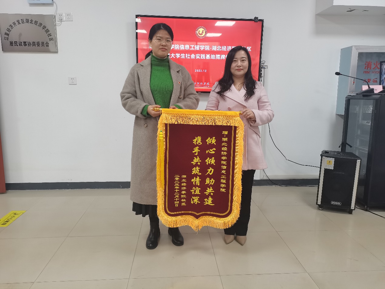 会议最后,徐玮玉代表太阳集团社区向我院赠送锦旗,陈珊珊代表学院接收锦旗,并共同为“大学生社会实践基地”揭牌。