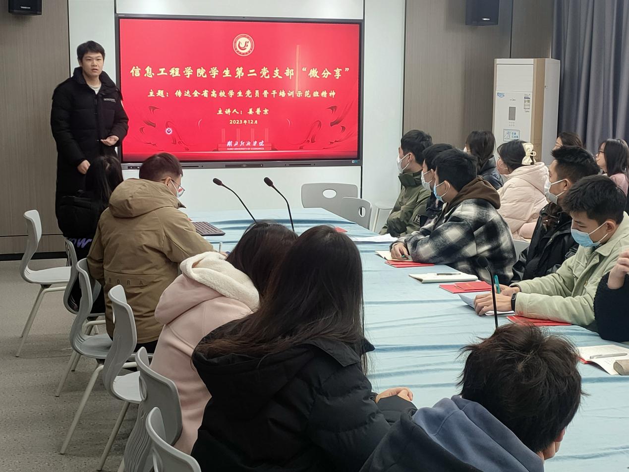 姜普京用省教育厅组织部杨作成部长在培训班开班式上的讲话来开启本次微分享,将杨部长“认真学思想,夯实理论根基”、“唐正学党性,培养党性品格”、“扎实重实践,练就过硬本领”和“勤奋建新功,强化使命担当”的殷切期望传达给党支部党员同志们。以培训班的四门课程“认真学习党章,严格遵守党章”、“勇于自我革命,敢于接力奋斗”、“为新征程贡献青春力量”和“深刻领会伟大建党精神的丰富内涵和时代价值”为主题,向党支部党员们讲解培训教师所讲授的党史国史、党风党纪、科学理论、方法经验等方面的重点内容。