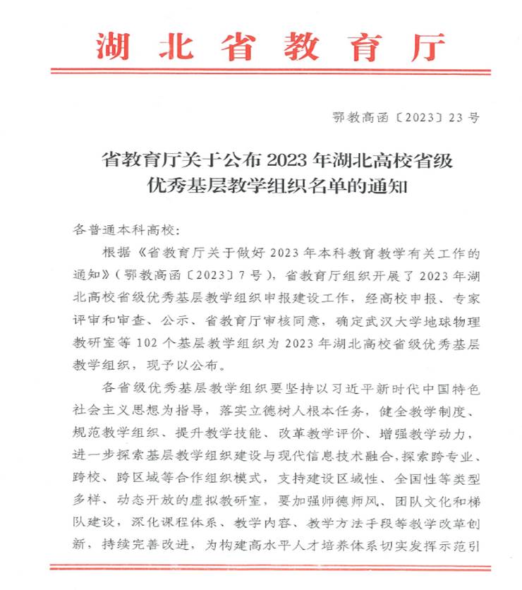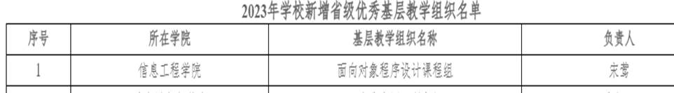 本网讯(通讯员:宋莺)近日,湖北省教育厅发布《2023年度省级优秀基层教学组织认定结果的通知》(鄂教高函〔2023〕23号),认定我院“面向对象程序设计课程组”团队为2023年湖北高校省级优秀基层教学组织。