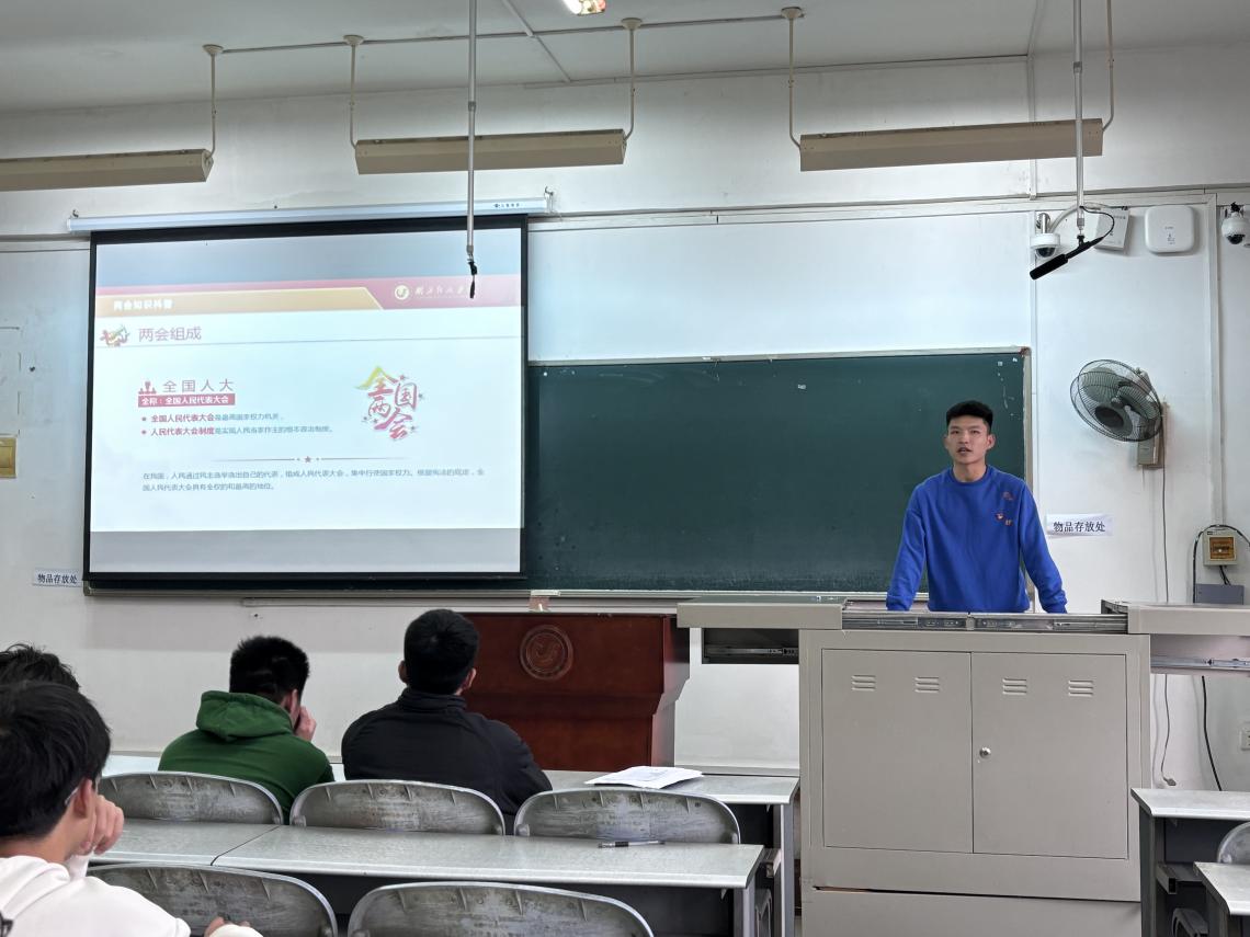 郭子鹏以两会为出发点,向大家科普两会相关知识,并分享了国防建设方面的心得。从他的分享中同学们了解到新兴领域战略能力是国家战略体系和能力的重要组成部分。这关系我国经济社会高质量发展,关系国家安全和军事斗争主动,对以中国式现代化全面推进强国建设、民族复兴伟业具有重要意义。作为一名青年学生,要强化使命担当,深化改革创新,全面提升科技创新能力。