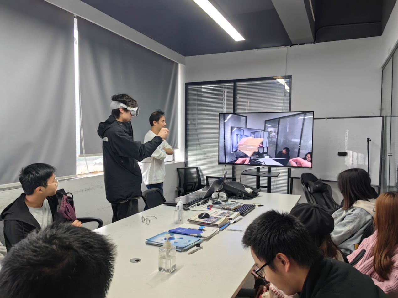 首先由技术覃总监让同学们戴上最新的苹果眼镜Apple Vision Pro,让同学们对增强现实可穿戴设备有了一定的了解。并非常有兴趣的了解如何深入了解行业内的应用和需要掌握哪些相关知识。